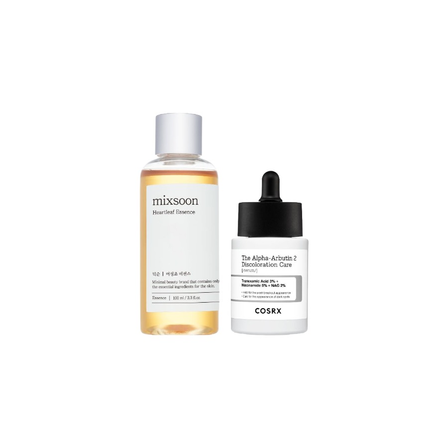 Ønsker du å behandle akne- eller kvisearr? Da er dette duoen for deg: Heartleaf Essence & The Alpha-Arbutin 2 Discoloration Care Serum! Heartleaf Essence fra Mixsoon har et høyt innhold av heartleaf som roer ned og beskytter huden. I tillegg virker det anti-inflammatorisk og anti-bakterielt. Essensen hydrerer huden og kan bidra til å forebygge nye akneutbrudd. Det er også en effektiv essens for å roe ned rødheter! COSRX The Alpha-Arbutin 2 Discoloration Care Serum er et serum basert på traneksamsyre, alpha arbutin og niacinamide. Kombinasjonen av disse ingrediensene virker effektiv på aknearr og generelt hyperpigmentering. Ingredienser som hyaluronsyre, panthenol, tocopherol og allantoin virker også beroligende og styrkende.