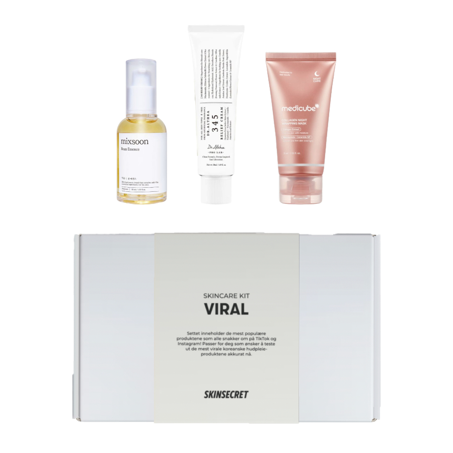 Inneholder de mest populære produktene som alle snakker om på TikTok og Instagram! Passer for deg som ønsker å teste ut de mest virale koreanske hudpleieproduktene akkurat nå. Gavekittet består av tre virale produkter i full size pakket inn i en fin gaveeske: MEDICUBE Collagen Night Wrapping Mask, MIXSOON Bean Essence  og Dr.Althea 345 Relief Cream