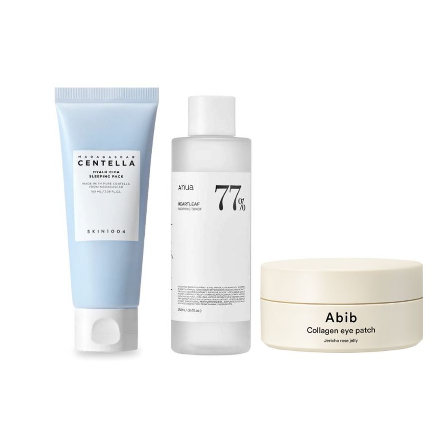 Det perfekte settet å unne seg hvis du ønsker litt ekstra pleie til huden i påsken! Settet består av Anua Heartleaf Soothing Toner, som virker beroligende og behagelig på irritert og sensitiv hud, samtidig som den tilfører fukt. Huden føles kjøligere, mykere og mer balansert etter bruk. For hjemmespa følelsen har vi inkludert Abib Collagen Eye Patches, som gir øyeområdet fukt og elastisitet med kolleagen – samtidig som huden får en oppfriskende effekt. Skin1004 Hyalu-Cica Sleeping Pack er super å bruke som en behandling på natten for å låse inn fukt og næring mens du sover. Den styrkende kombinasjonen av hyaluronsyre og cica reparerer, beroliger og gir huden en myk, frisk og velpleid finish når du våkner.