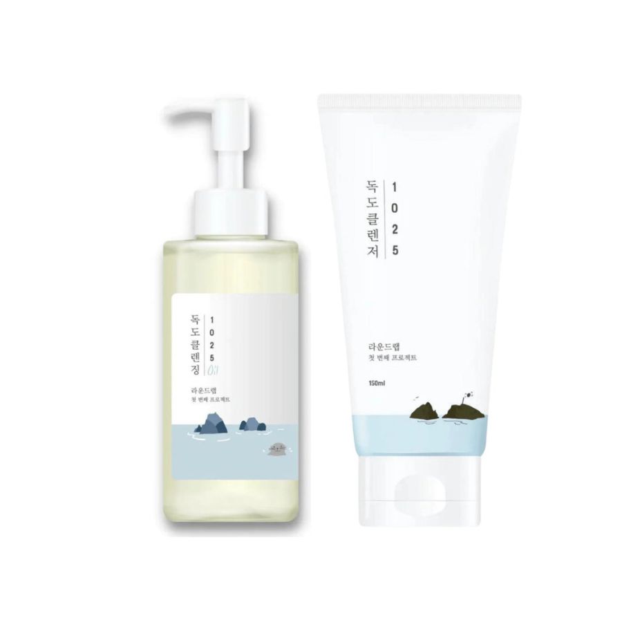 Jeg består av Round Lab 1025 Dokdo Cleansing Oil, en lett oljerens som smelter bort sminke, solkrem og smuss uten å forstyrre hudens fuktbalanse, og 1025 Dokdo Cleanser, en mild vannbasert rens med lav pH som renser skånsomt uten å etterlate huden stram eller tørr. Sammen gir vi deg en grundig, men fuktbevarende rens som styrker hudbarrieren og etterlater huden myk, rolig og hydrert. Perfekt for deg som ønsker en rens som både pleier og beskytter tørr hud i dybden.
